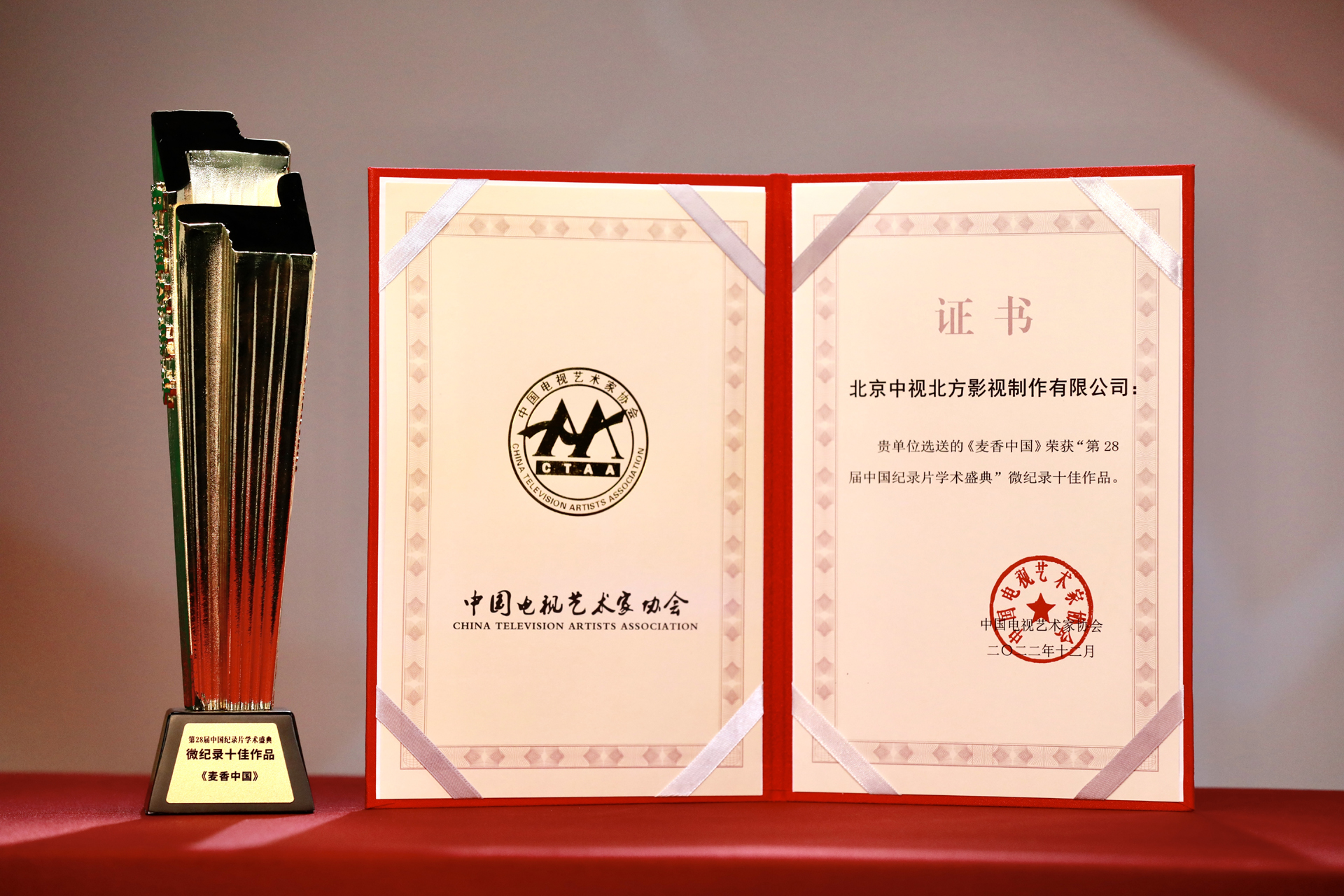 2022年(nian)12月31日(ri),中(zhong)視北方(fang)選送的(de)《麥香中(zhong)國(guo)》榮獲中(zhong)國(guo)電(dian)視藝術(shù)傢(jia)協會授(shou)予的(de)“第28屆中(zhong)國(guo)紀錄片學(xué)術(shù)盛(sheng)典”微紀錄十佳作(zuò)品(pin)。